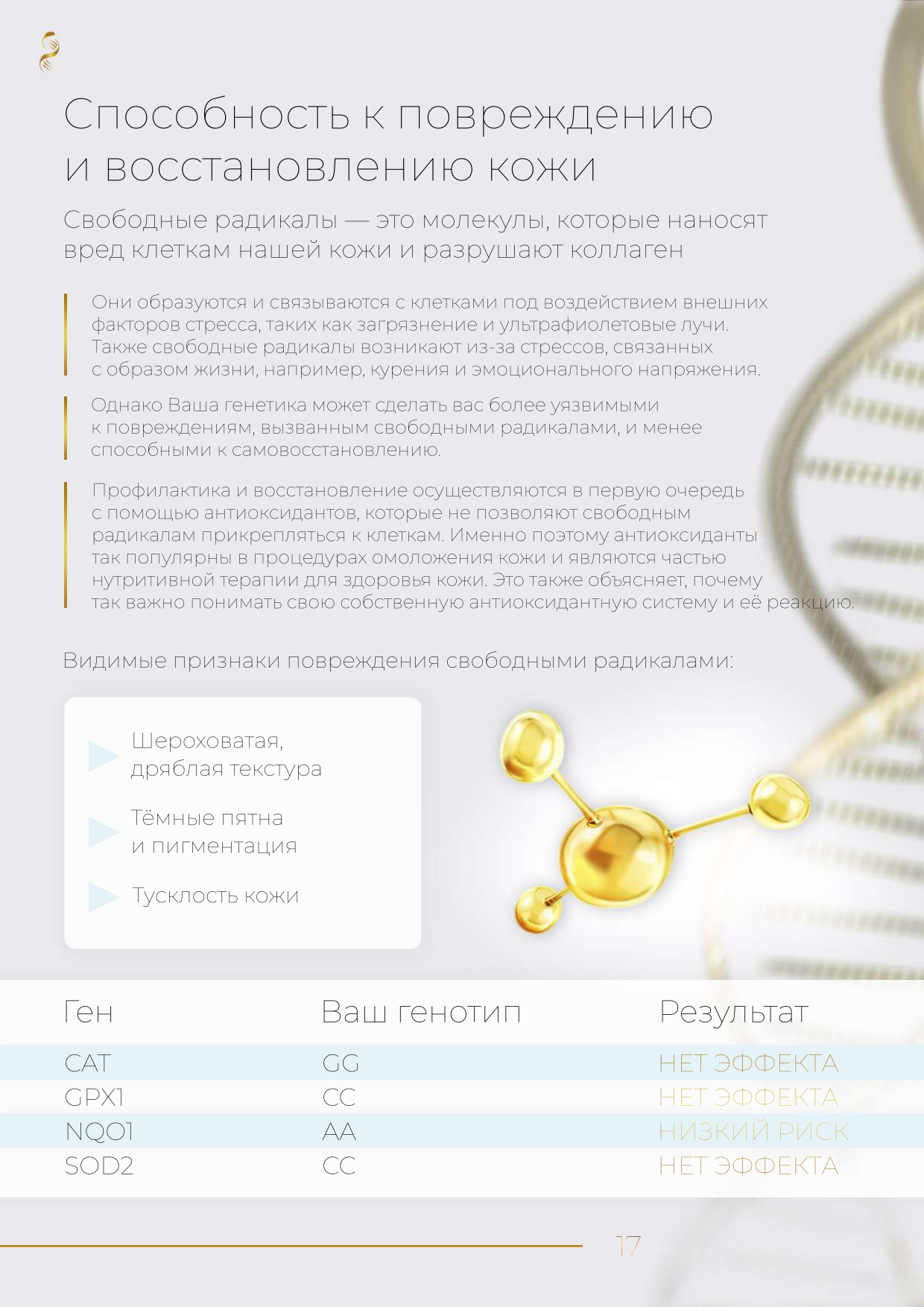 +7 (343) 288-53-19ДНК-тест Skin Care (генетика красоты) помогает понять, как именно ваши гены влияют на состояние кожи и волос. Это не медицинский диагноз, а персонализированный генетический отчёт, который показывает врождённые особенности организма и даёт рекомендации по уходу.